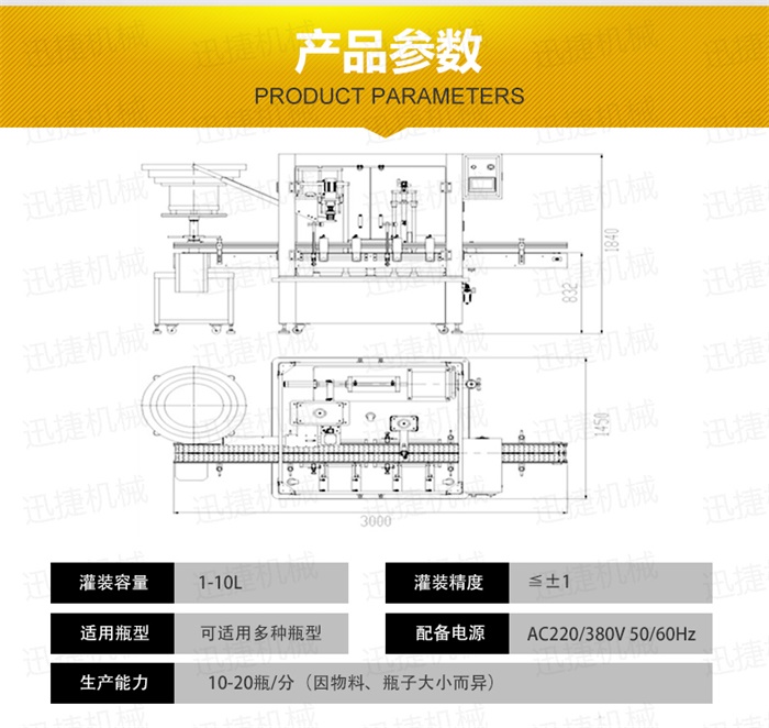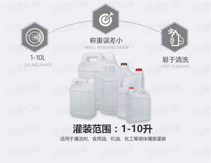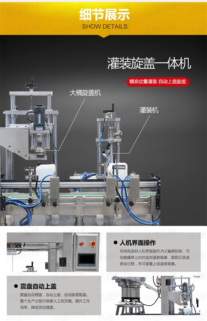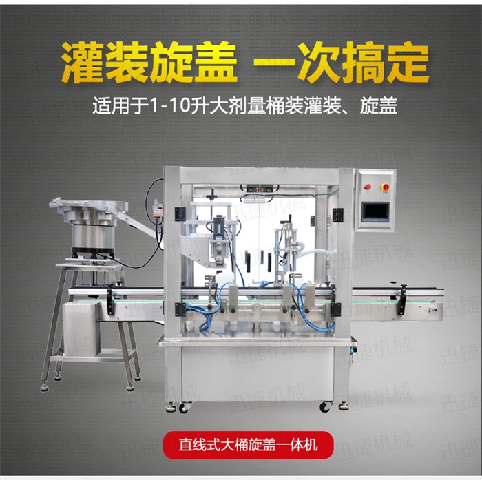 特點:定量灌裝,和瓶蓋旋蓋,在一臺機器上完成。具有占地空間小,自動化程度高特點工作流程:液體灌裝頭自動定位定量灌裝,機器灌裝完成1-10升的灌裝,隨即進入下一個工位,震盤自動理蓋,自動上蓋,自動旋緊瓶蓋。整個生產過程只需要人工放空桶。提升工作效率,降低勞動強度。