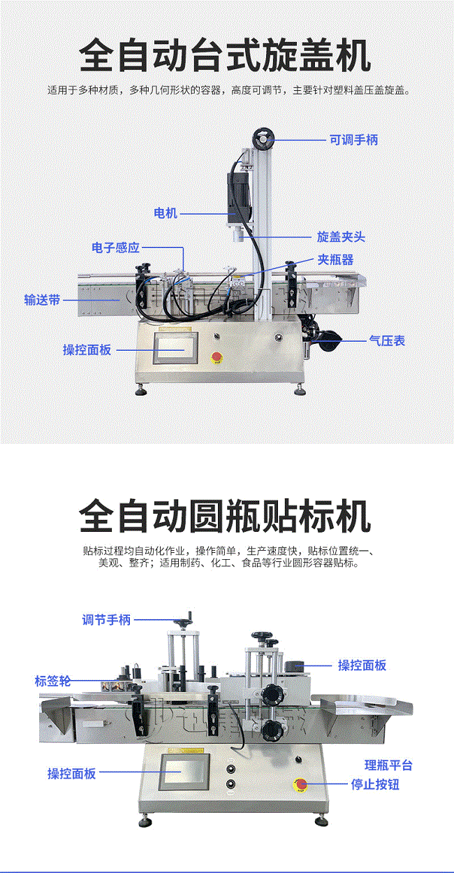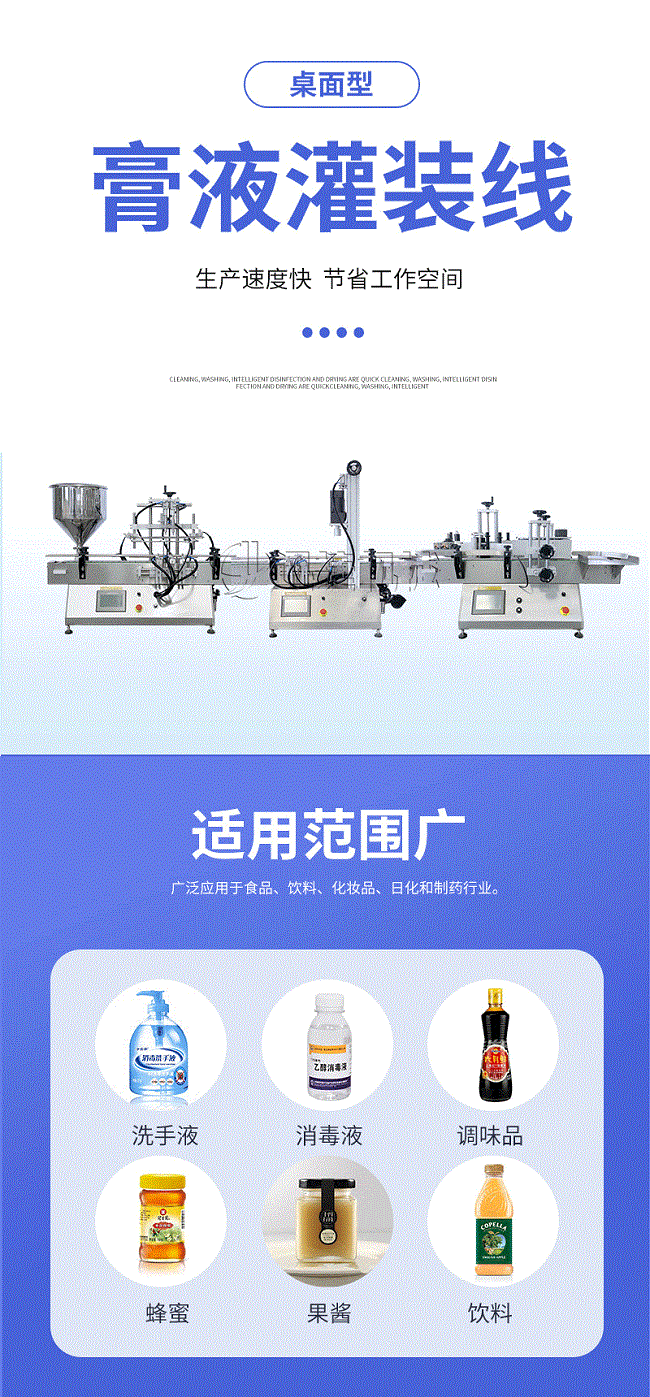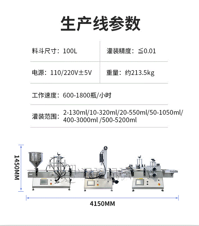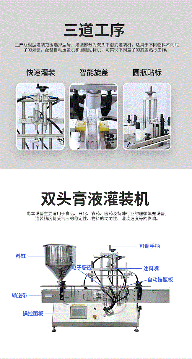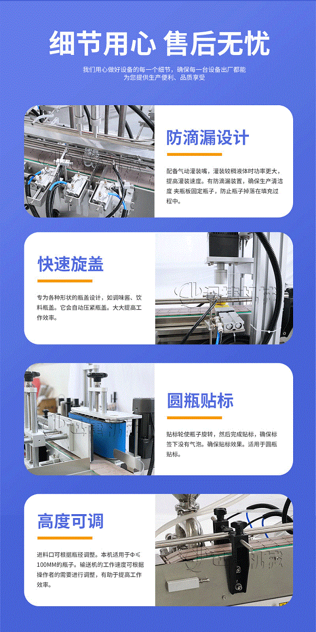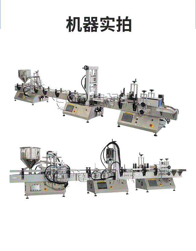 產(chǎn)品說明:生產(chǎn)線根據(jù)灌裝范圍選擇型號,灌裝部分為雙頭下潛式灌裝機,適用于不同物料不同瓶子的灌裝,配備自動壓蓋機和圓瓶貼標機,可實現(xiàn)不同蓋子的旋蓋貼標工作。