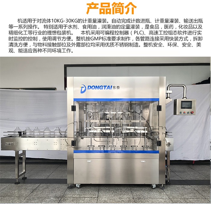 機(jī)適用于對流體5kg-30kg的計重量灌裝。自動完成計數(shù)進(jìn)瓶、計重量灌裝、輸送出瓶等一系列操作。 特別適用于水劑、食用油,潤滑油的定量灌裝,是食品,醫(yī)藥,化妝品以及精細(xì)化工等行業(yè)的包裝機(jī)。本機(jī)采用可編程控制器(PLC)、高速工控組態(tài)軟件進(jìn)行實時監(jiān)控的控制,使用調(diào)節(jié)方便。整機(jī)按GMP標(biāo)準(zhǔn)要求制作,各管路連接采用快裝方式,拆卸清洗方便,與物料接觸部位及外露部位均采用優(yōu)質(zhì)不銹鋼制造。整機(jī)安全、環(huán)保、安全、美觀、能適應(yīng)各種不同環(huán)境工作。