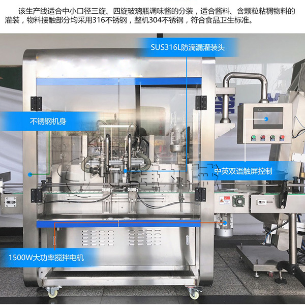 該機(jī)為雙頭辣醬灌裝機(jī),配有自動(dòng)攪拌功能,使物料混合更加均勻 ,有效的解決灌裝誤差大的問(wèn)題;雙頭辣醬灌裝機(jī)輔料添加料可調(diào),精準(zhǔn)方便,提高自動(dòng)化程度。 雙頭辣醬灌裝機(jī)氣動(dòng)部分均采用知名氣動(dòng)元件,壽命長(zhǎng),穩(wěn)定。 物料接觸部分采用SUS316L不銹鋼材料制成,符合食品醫(yī)藥安全衛(wèi)生要求。 灌裝閥由氣動(dòng)閥控制,灌裝精度更高。 這款雙頭辣醬灌裝機(jī)幫您解決醬會(huì)堵塞的問(wèn)題